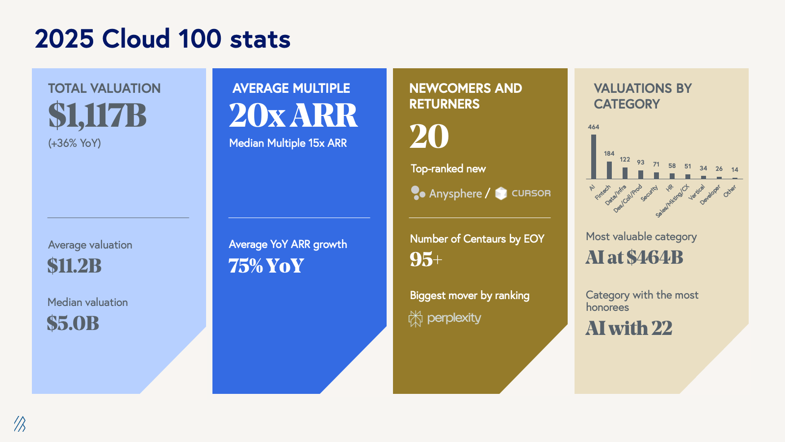 Bessemer’s annual rankings of the 100 top private SaaS companies. This year’s cohort hit a record $1.1T in value, with AI-native firms scaling to $100M ARR in just 5.7 years on average (vs. 7.5 overall) and earning higher multiples (24x vs. 19x for peers). At the same time, overall SaaS multiples have compressed to 20x, down 41% from the 2021 peak, signaling investors now prize disciplined monetization over unchecked growth.